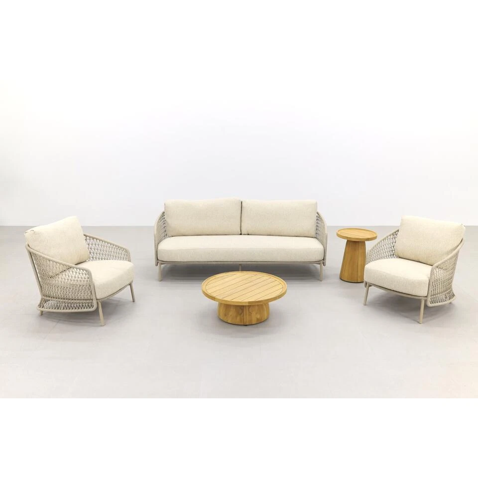 Genieten van optimaal comfort en het perfecte plaatje. 4 Seasons heeft haar best gedaan met deze loungeset om het allemaal werkelijkheid te maken! Het prachtige touwpatroon van de Puccini bank en stoelen, het detail in het teakhout en natuurlijk de prachtige latte kleur. Deze solo kleur in de stoelen en de bank zorgt voor een unieke uitstraling. Daarbij past het warme teakhout van de Pablo koffietafels perfect bij! Door de royaal gevulde kussens zit je uitstekend in deze loungeset! Je drankje kan je gemakkelijk kwijt opeen van de twee koffietafels. Wat wil je nog meer? Helaas hebben wij geen invloed op de zon, al kan deze set ook tegen een regenbui! Bestellen kan direct online. Liever eerst even proefzitten? Kom dan langs in onze showroom in Opheusden, Duiven of Apeldoorn. Je bent van harte welkom!