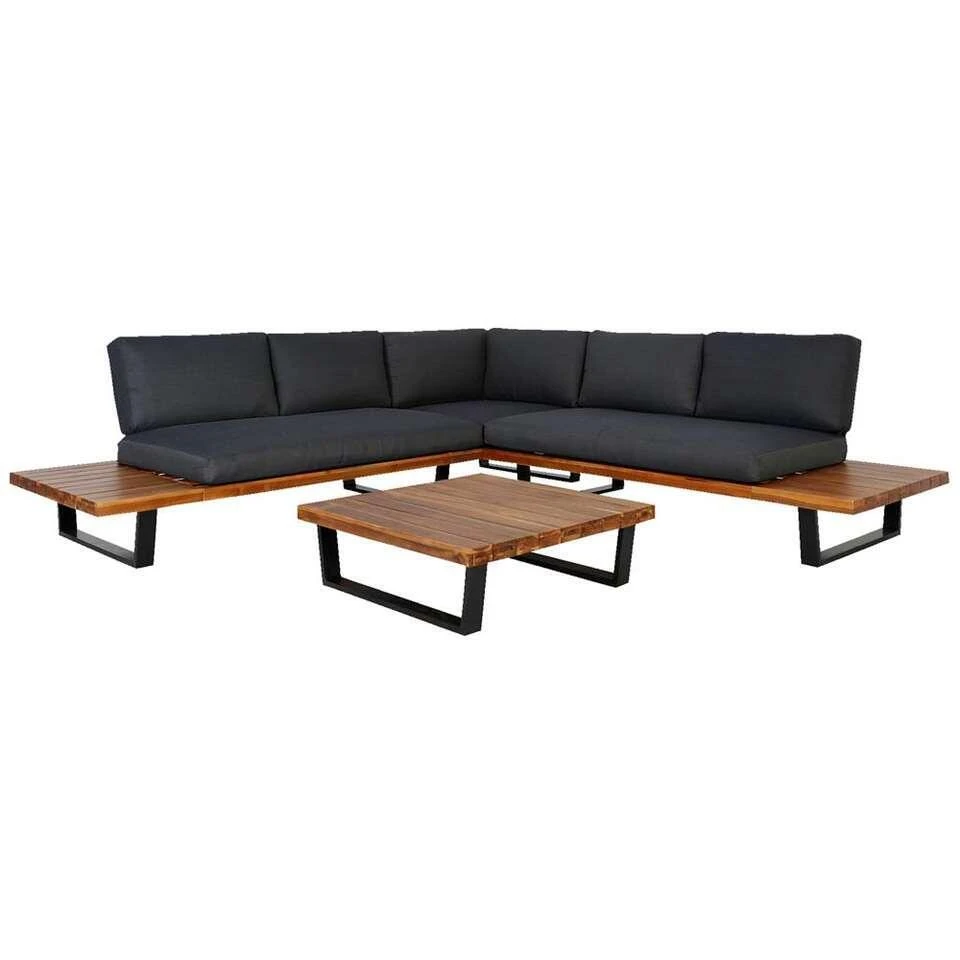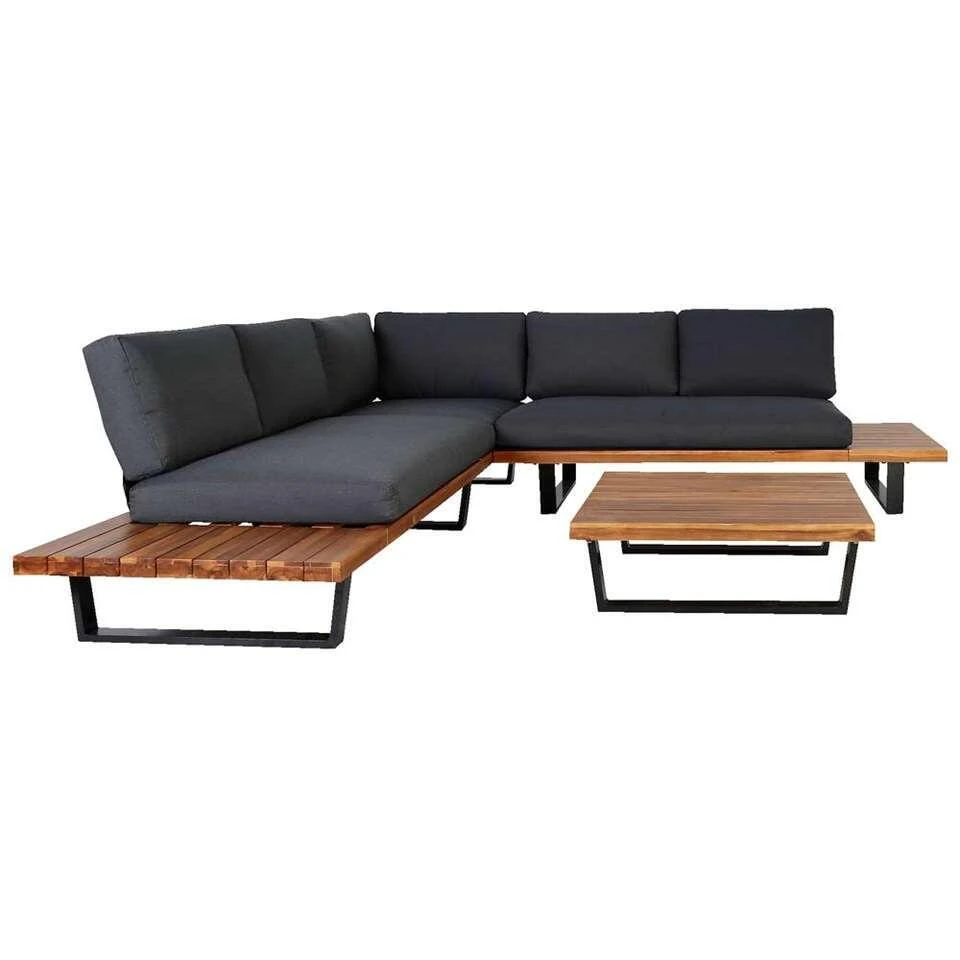 Hoekset Albi is een 3-delige loungeset die bestaat uit een hoekloungebank (uit twee delen) en een vierkante bijzettafel. Deze trendy loungemeubelen zijn gemaakt van acaciahout FSC® en hebben een aluminium frame in de kleur antraciet. Deze sterke materialen kunnen tegen een stootje en passen uitstekend bij de natuurlijke trend van deze zomer! Hoekset Albi is een moderne plateauset die ruimte biedt aan 5 personen. De 2 extra zijtafeltjes die vastzitten aan het plateau van de bank kunnen meerdere functies hebben. Zet hier een lekker drankje op, leg je tijdschrift hier neer of decoreer deze zijtafeltjes met een mooie pot en bloemetjes. De antracietkleurige rugkussens kunnen over het frame heen geschoven worden, waardoor deze goed op hun plaats blijven zitten. De kussens worden meegeleverd, dus voetjes omhoog en geniet direct van een heerlijk rustmomentje.