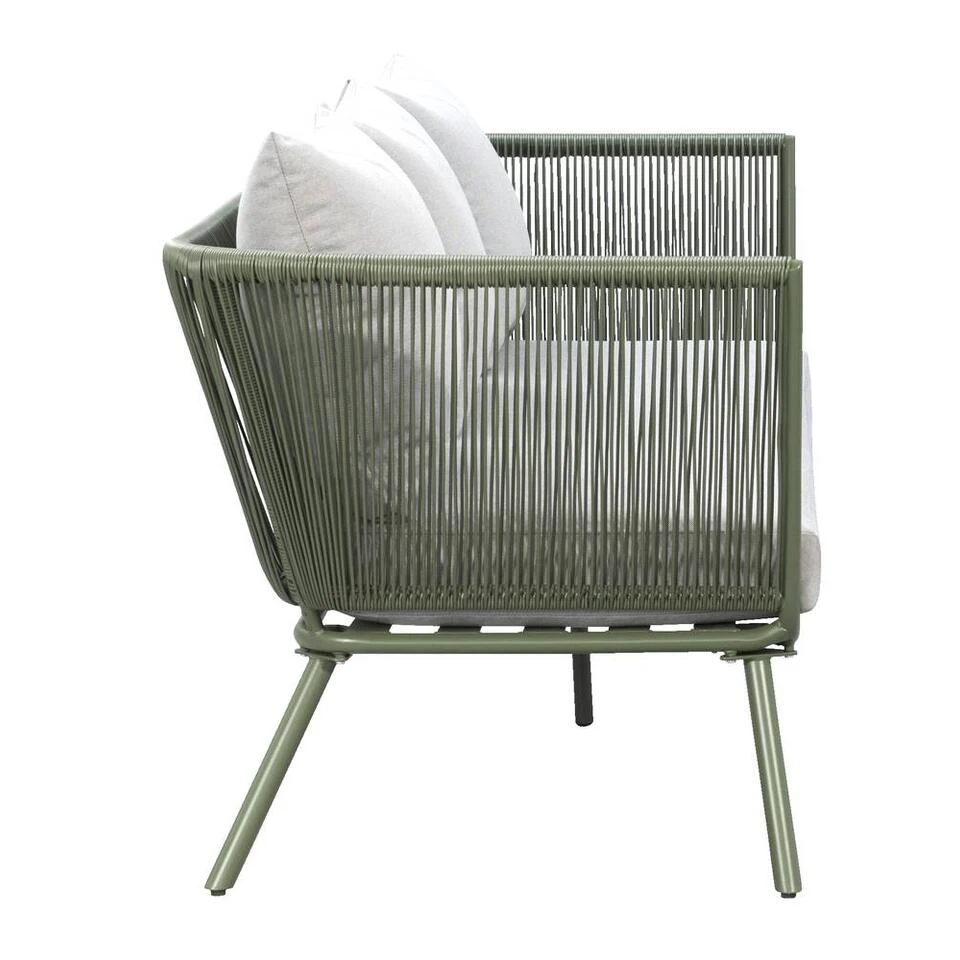 Dit is een moderne, trendy tuinbank met een eigentijdse look. Loungebank Almeria is gemaakt van olijfgroen metaal. Dit geeft de loungebank een moderne en stoere uitstraling. Door het gebruik van weerbestendige en onderhoudsarme materialen is deze loungebank perfect voor buiten gebruik. En natuurlijk de perfecte keus als je wilt genieten van mooie, stijlvolle meubelen, maar geen tijd kwijt wilt zijn aan het onderhoud. Deze 3-zitsbank wordt geleverd inclusief heerlijk comfortabele grijze loungekussens. Dus leun achterover en laat het genieten beginnen.