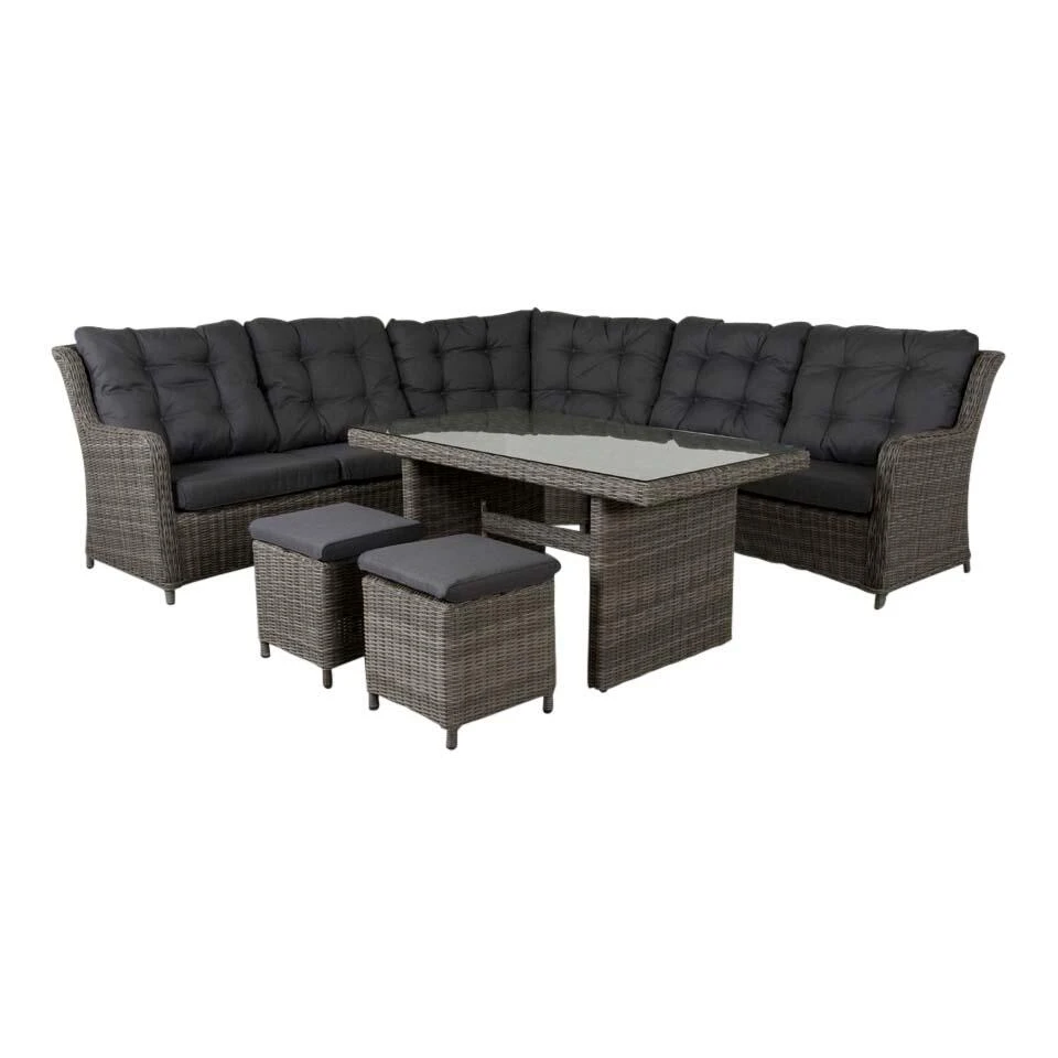 De lounge dining set Richmond is de loungeset die twee werelden in een brengt. De dining loungeset is een echte loungeset maar geeft ook de mogelijkheden om te dineren in de set. Dit komt door de hoge loungetafel. De set heeft een lekkere hoge rugleuning wat ervoor zorgt dat je veel steun in de rug hebt. De rugkussens zijn gecapitonneerd, dit geeft de richmond lounge dining set een luxe uitstraling. Het XL hoekelement zorgt voor een extra zitplaats in de bank. De leuke bijzetkrukjes zijn geschikt als zitplaats maar ook te gebruiken als voetenbankje.