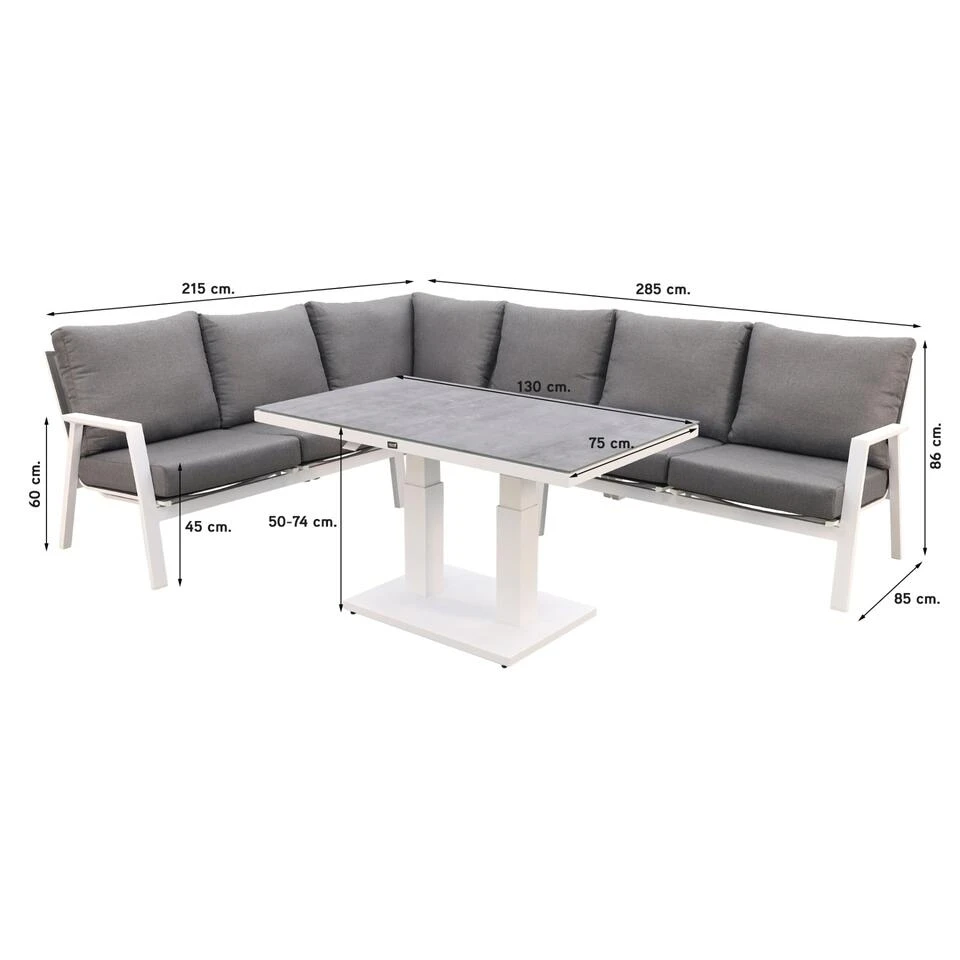 Lounge dining set met een strakke vormgeving. De Azoren lounge dining set white is geschikt voor 6 personen. Heerlijk loungen en genieten van de zon of juist genieten van een heerlijk diner aan tafel. Doordat de tafel verstelbaar is in verschillende standen is de Azoren lounge dining geschikt voor beide. De tafel is eenvoudig te verstellen middels een hendel aan de onderkant van het tafelblad. De hendel werkt op een gasveer en is dus eenvoudig te bedienen. De tafel is verstelbaar van 50 cm. tot 74 cm. hoogte. Ideaal, zo kunt u altijd zelf de gewenste hoogte bepalen. Geniet van extra gemak met de Azoren lounge dining set, loungen en dineren in één.