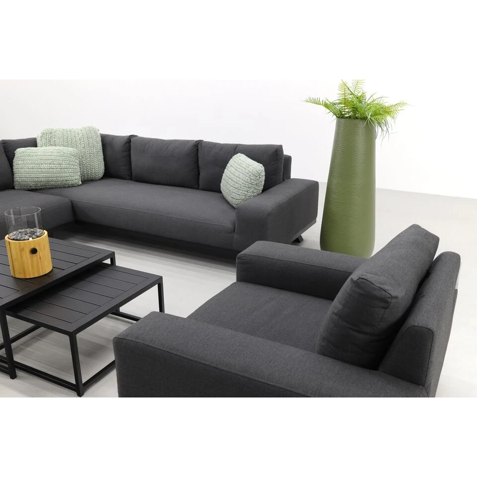 De Barcelona loungeset heeft een stevig aluminium frame welke afgewerkt is met een antraciet kleurige coating. Aluminium heeft als voordeel dat het niet kan verroesten en weinig onderhoud nodig heeft. Daarnaast is het ook nog eens licht van gewicht. Om dit frame is de weerbestendige Sunbrella stof bevestigd. Deze stof is water en vuil afstotend en eenvoudig schoon te maken met water en eventueel een sopje. Het frame van de loungetafel is ook gemaakt van aluminium en heeft een tafelblad van keramiek. Keramiek heeft een hoge krasvastheid en is bestand tegen zowel hoge als lage temperaturen. Hierdoor is het tafelblad perfect geschikt voor buitengebruik.