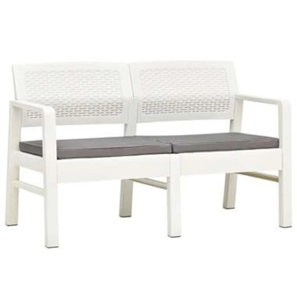 De levering bevat 1 kunststof bank en 2 zitkussens.